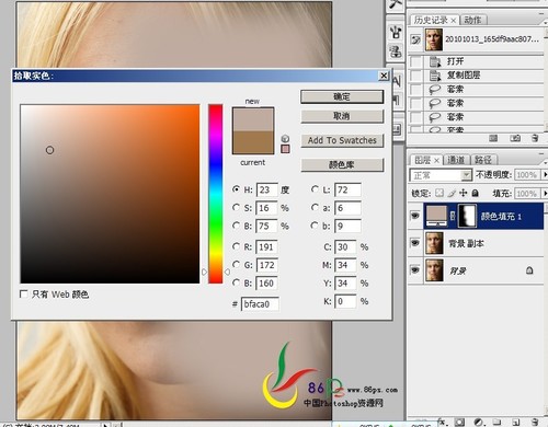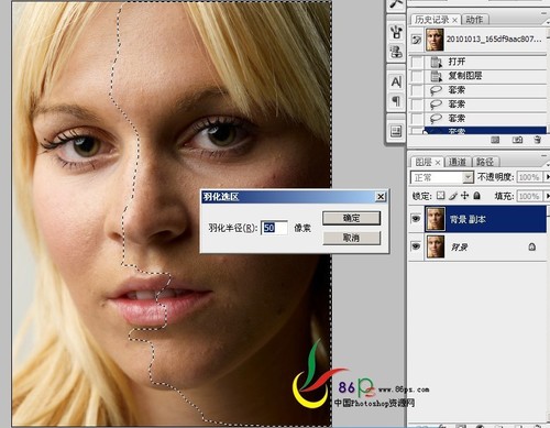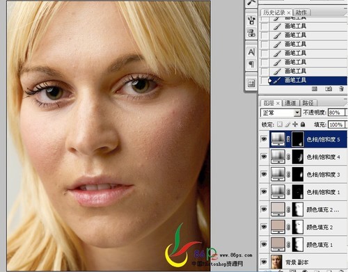 五、用套索工具将脸边、脖子有色斑的地方选出来,羽化,用色相/饱和度调整,再用画笔在蒙版里修饰。前面的调整就到此(图五)。