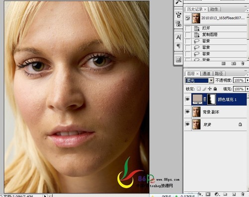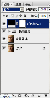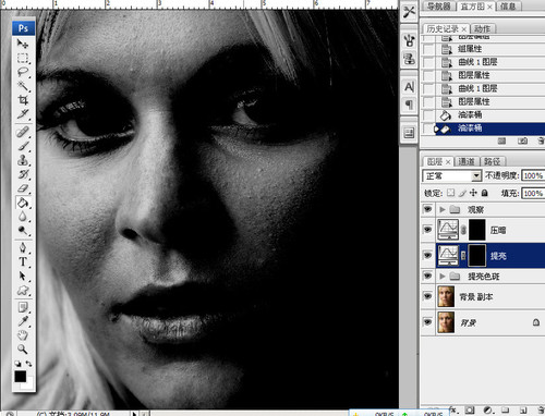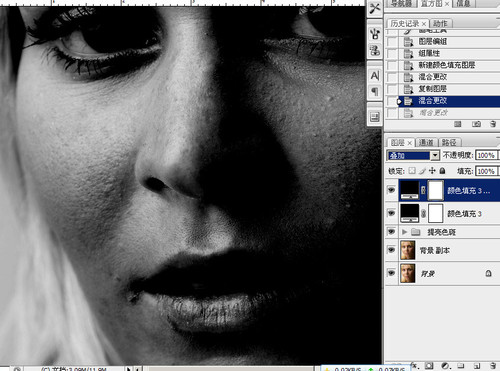 这样皮肤的暗斑问题这些就很清楚直观得呈现出来了,这两个黑色层对图片不起作用,只是作为方便观察之用,修图的时候如果是看彩色的图片,很容易头晕眼胀,看黑白的就不会了。