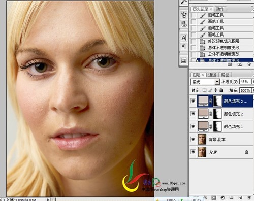 四、再建几个相似的颜色层,我再用了两个,模式也是用柔光,根据图片情况调整图层的不透明度,用黑色画笔在蒙版里把眼珠、鼻孔、阴影等这些地方擦出来,注意画笔的不透明度(图四)。
