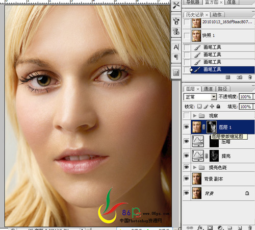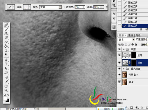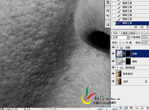 十二、亮点就在压暗曲线上擦试,要据情况变换画笔的大小和不透明度。边修边缩小图片、关掉观察组的眼睛查看效果(图十二)。