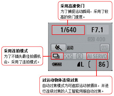 拍摄高速运动的人或物,在过去是需要高超的摄影技巧和丰富经验的。这包括对运动物体持续对焦的技术以及保证不出现抖动以获得锐利成像的能力。而相机的运动模式在这两方面都为我们提供了帮助。自动对焦功能将追踪正在运动的被摄体,进行连续对焦。对焦点选择也自动完成。同时,为了能够凝固被摄体的运动瞬间,相机自动采用较高的ISO感光度以保证较高的快门速度。而且运动模式还采用了连拍功能,提高了捕捉瞬间机会的能力。当被摄体进入画面后,半按快门按钮,开始自动对焦。只要被摄体在画面内,保持半按快门按钮的状态就可追踪被摄体持续自动对焦。当确定机会来临时完全按下快门按钮并保持按下状态,这样将连续拍摄动态瞬间,可提高捕捉最佳瞬间的机率。为了充分发挥这些性能,应采用具备防抖功能的远摄镜头,以获得最佳效果。
