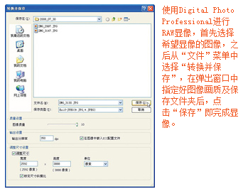| 通过ZoomBrowzer EX选择图像,并在“任务区域”的“编辑”菜单中选择“处理RAW图像”。 | 白平衡、亮度、色调等可以根据自己的喜好进行调整。 | 图像调整完成后,从“文件”菜单中选择“保存图像”,并在指定好图像画质及保存文件夹后点击“保存”完成显像。 |