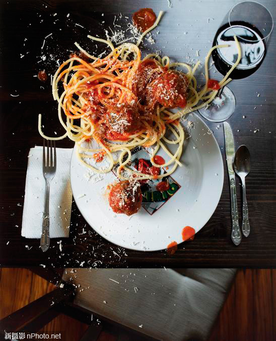 这些作品是千真万确的、甚至是反传统的二维图像。摄影师Piciottis是如何拍摄的呢?正如大多数影室作品一样,布光发挥了至关重要的作用。上面那张作品中精心制作的意大利面条和肉丸下面的桌椅、地板和餐具实际上是打印出来的照片,而非实物。为了欺骗视觉,让这个场景看起来像是一次拍摄的照片,在“房间设施”和意大利面的光线上,色温和密度必须一致。这可不容易,因为桌面的光线来自窗户,而意大利面的光线则来自闪光灯。